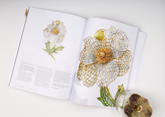For all of these reasons, the Matilija Poppy proved to be the perfect muse for a budding project conceived in 2015 by MAC Jewelry/Metals Coordinator, Nancy Gardner, and my friend and colleague, acclaimed jewelry artist Tom Herman. Together they envisioned Tom leading a hands-on jewelry crafting workshop that would lead participants into collaborating on a piece, which would be auctioned to benefit the Mendocino Art Center. Tom immediately thought of me to join him in this endeavor, contributing not only plique-à-jour enameling to the piece but also to instruct a workshop at MAC on the process.