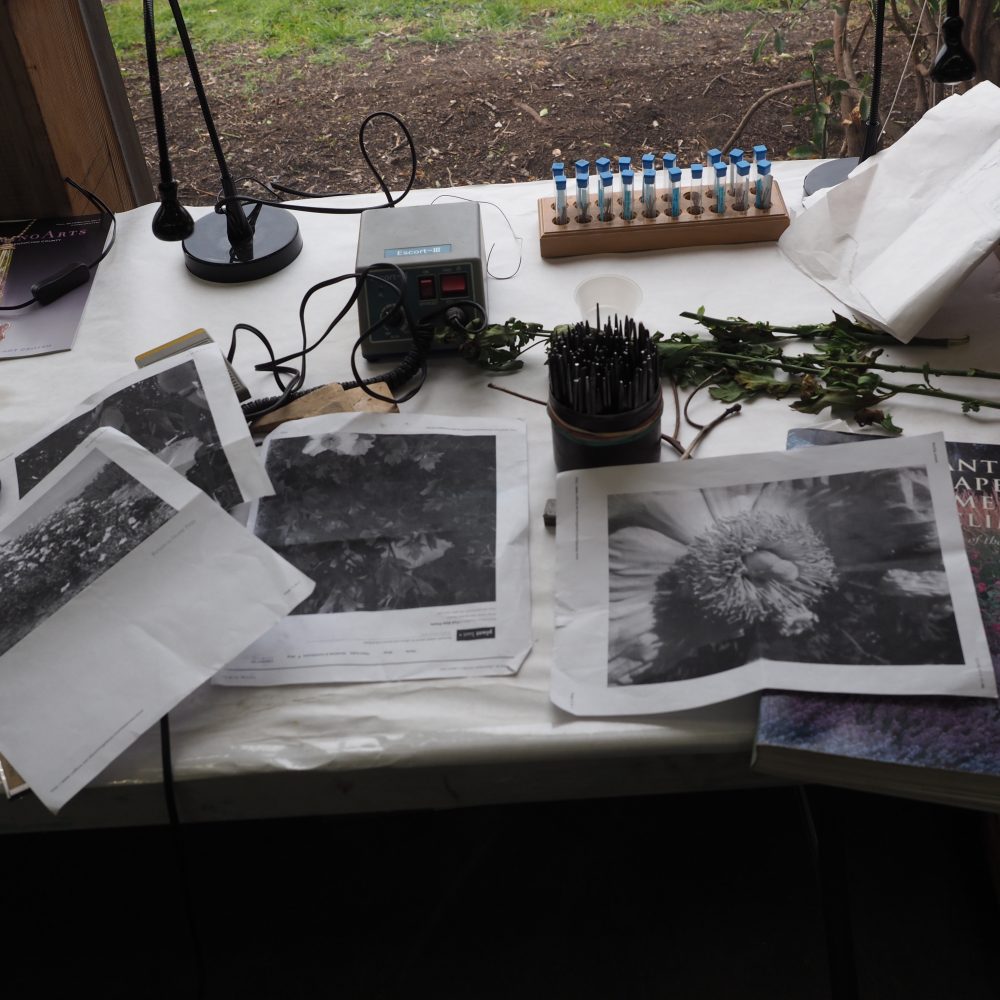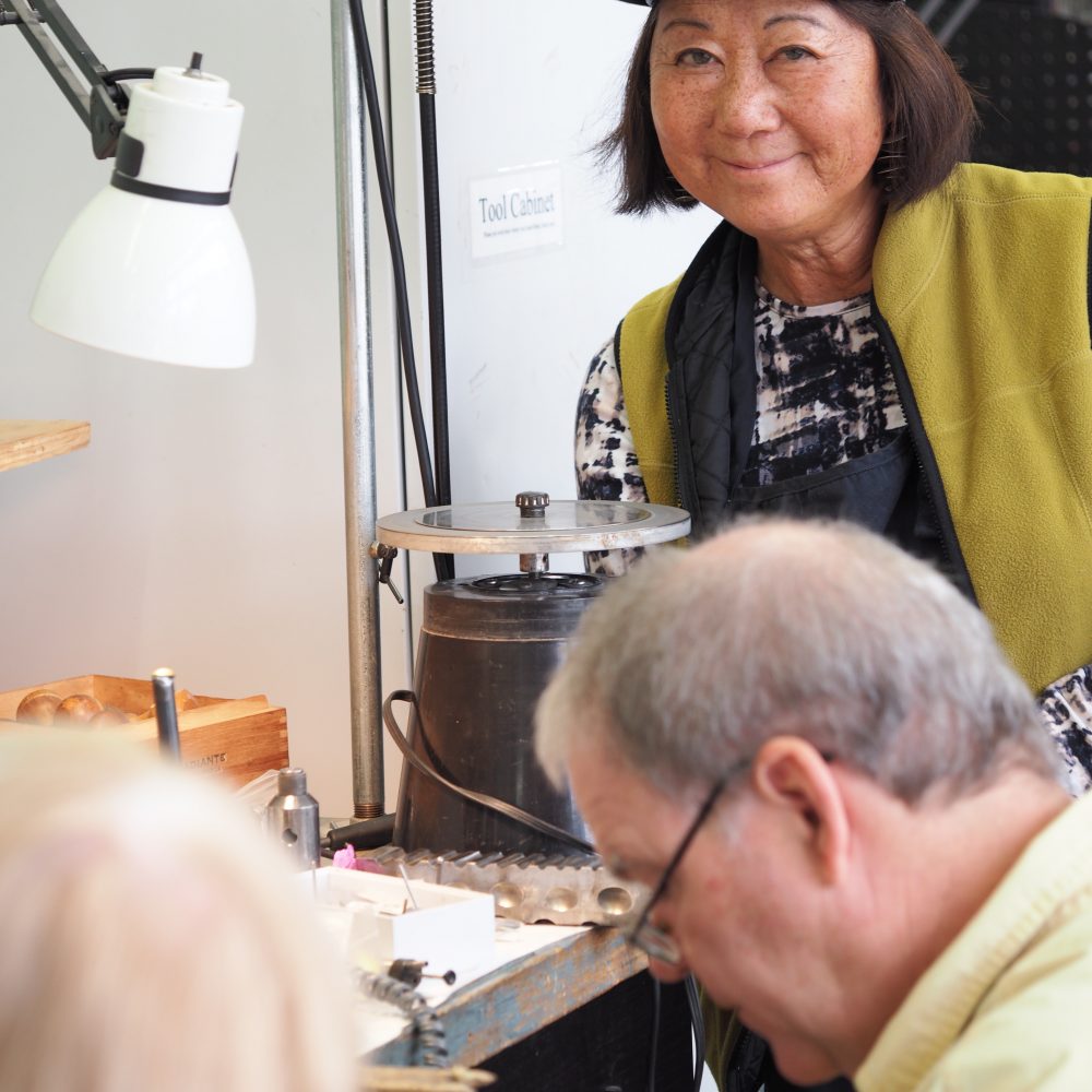 We entered, the Matilija Poppy Project – and Challenge – to faithfully follow the Ada Brooch’s example to create a three-dimensional, plique-à-jour piece. And accepted! With all the artists going to the MAC for the workshops, we had our “atelier” of craftspeople.
