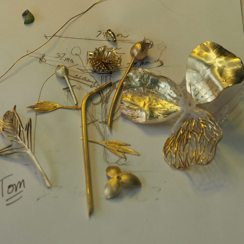 For two weeks straight, the lessons of the Ada Brooch were in full force. In the early 1900s construction of such jewels took many artists working on one piece to create such a masterpiece. In the last 50 years or so, the notion that an artist has to do everything solo is pervasive – and not at all true. The Mendocino workshops were a powerful testimony to the collaborative process. A great example of this was the poppy’s stamens. It was no easy trick to get those little spikes to stand just right, but one of Tom’s students, Dawn Nakanishi, had the perfect approach. And it became a permanent part of the poppy stamen structure and will probably be in all our minds in future flower construction.