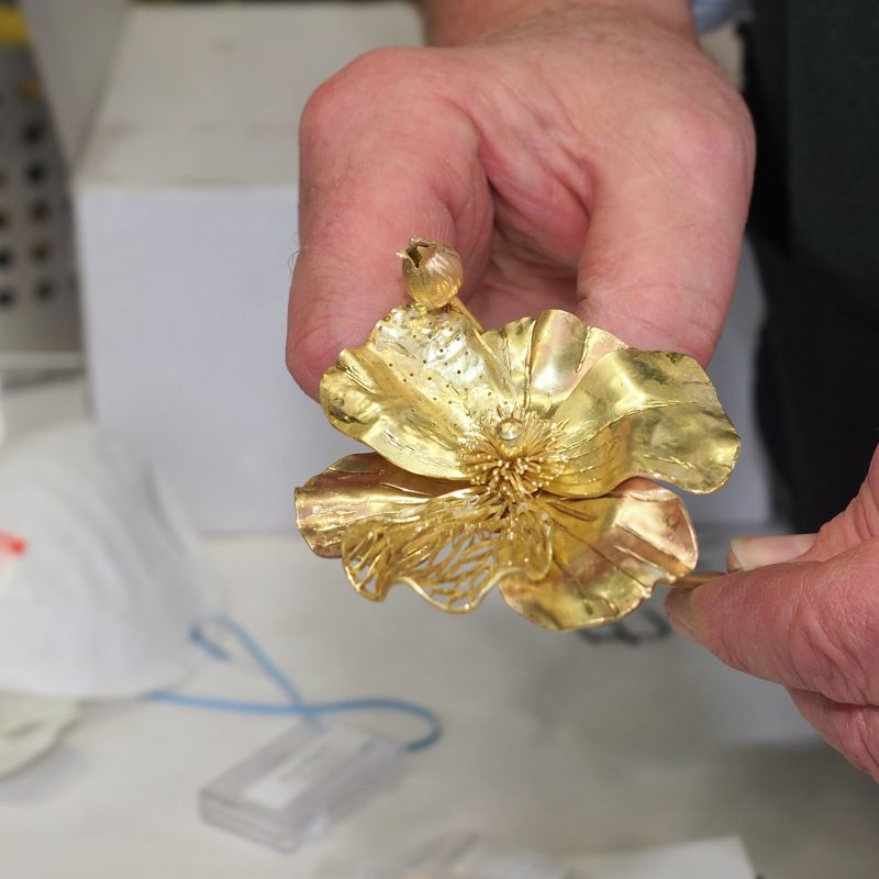 We completed the Matilija Poppy Brooch in October 2018, and are so grateful for the help of many fellow artists including Ethan Herman, Diana Casabar, Nancy Gardner, Bob Weinstock, Dawn Nakanishi, and John Cornacchia. As it is with real Matilija poppies, it was at first tricky to figure out how to structure the piece – but in the end, it has proven to be a piece we are all so very proud of.