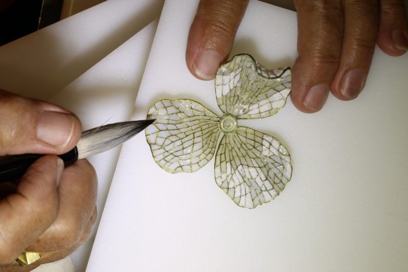 Tom said that his passion for the Matilija Poppy Brooch was his saving grace through those dire days. Even when he felt lousy, it was better to feel like crap at his bench, working on the project, than laying in bed. With the help of his son, Ethan, they continued, lots of saw piercing! Tom then fused segments that could be disassembled for the enameling process and relatively easily reassembled. At this point, it was fall and time to ship the beautiful framework he’d created to me.