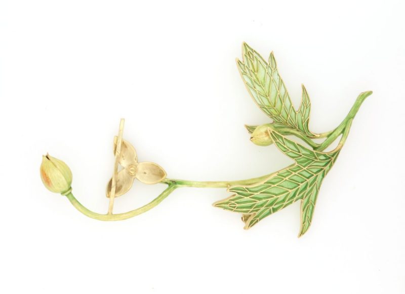 The Brooch is without a doubt above anything else Marcus & Co. had ever created, so beautifully crafted and intricately enameled, with mind-blowing articulation. Lyrical and stunning, the structure shows no signs of stress. The colors of enamel flowed softly and gently along the forged and chased gold stems and buds. The three-dimensional flowers and leaves allow the light to shine through to enhance the color of enamels in this plique-a-jour beauty. While filling large open cells on reoccurring surface curves, the artist accomplished an outstanding feat! You can view detail photos here https://alohilanidesigns.com/the-ada-brooch/As makers, Tom and I became obsessed with the construction of this piece, captivated by all the details from how languidly it moved to its unbelievable integrity and apparently stress-free structure, for going on a century. We researched its history as much as possible and added to our own educated estimates that it must have taken between five and seven craftspeople in the Marcus & Co. atelier to bring the Ada Brooch to life. It would take a collaborative process to devise something so complicated, and yet so elegant.