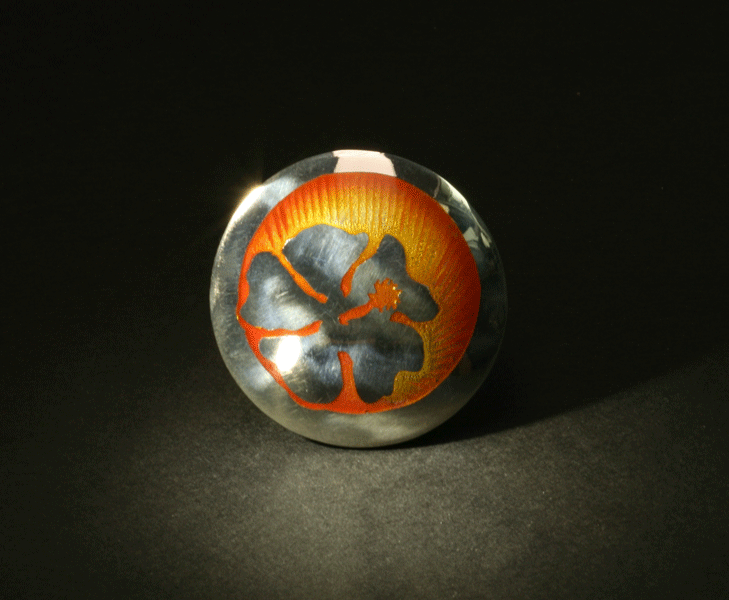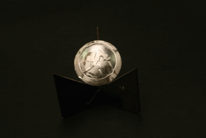 Second. etch out you place a resist on the areas you do not want the acid to removed such as asphaltum varnish, applied with a paint brush. Now you are ready to float the jewel in the acid. It is rather slow maybe 24 hours to remove the desired depth of metal.