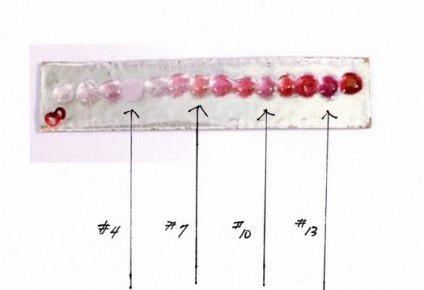 You can see on my test plate dot #4 is still grainy while the others are smooth. So #4 is a harder firing enamel and if placed next to #5 and you fired it long enough that both enamels were smooth in time the jewel will crack.