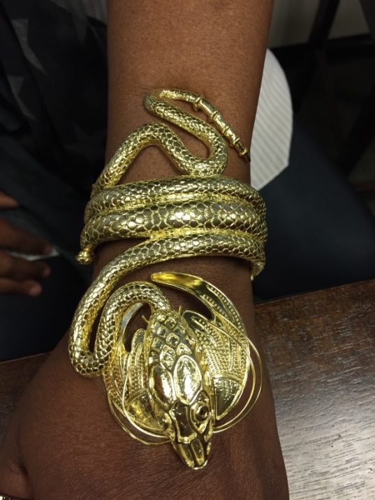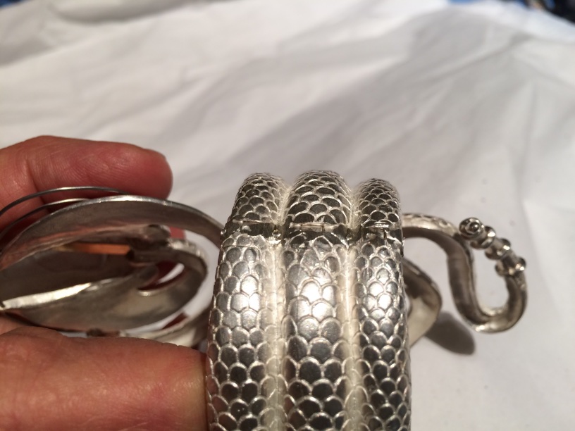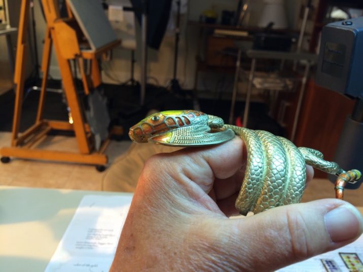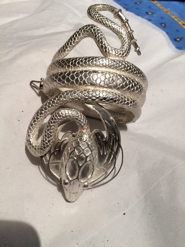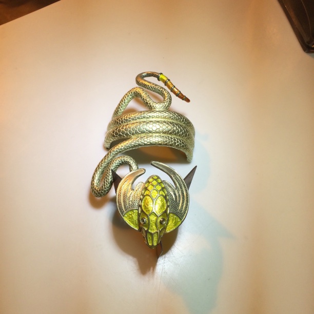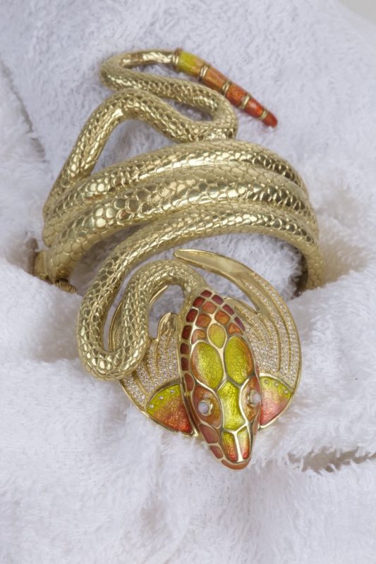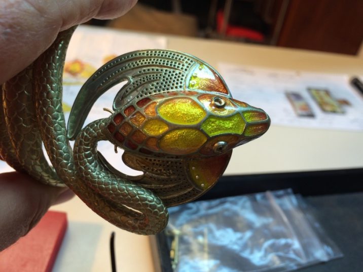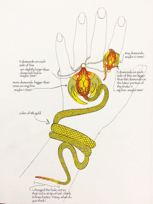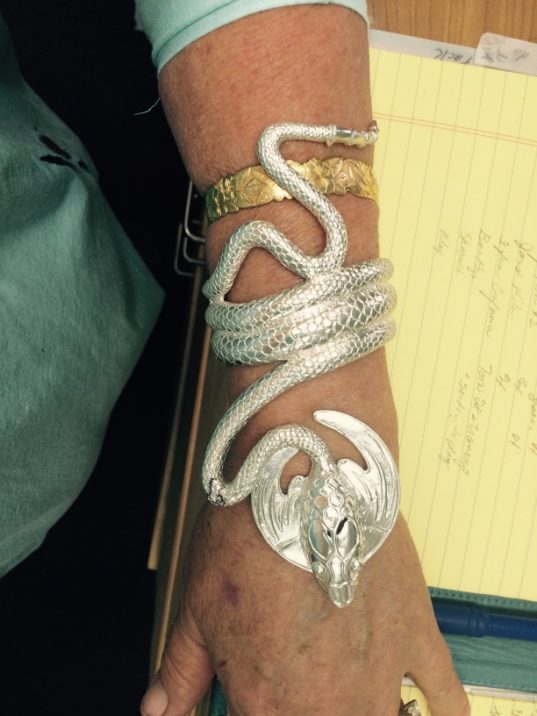 I joined Elisa Melegari a designer and artist, in creating a jewel called the “The Dragon”. Named by the client Whoopi Goldberg. This bracelet and ring combo was inspired by the bracelet designed by Alphonse Mucha and executed by George Fouquet, “The Serpent” 1899 for Sarah Bernhardt.