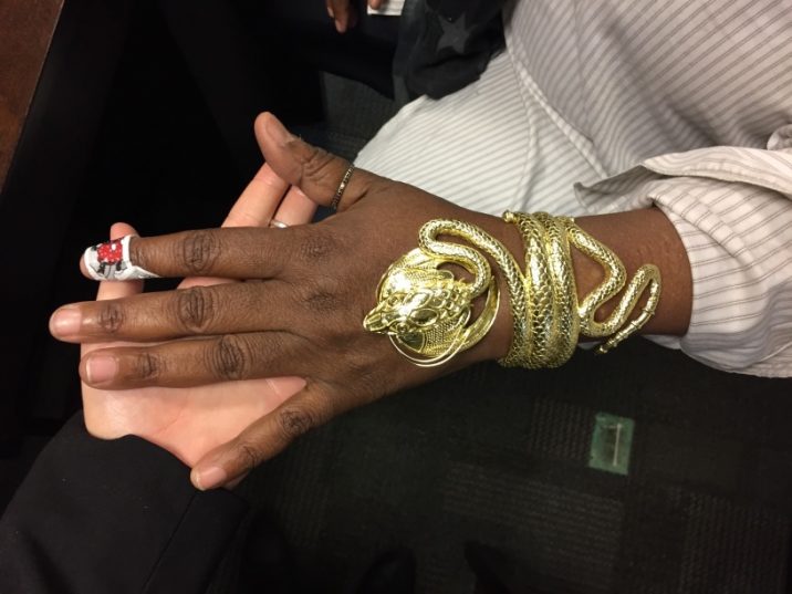 After the fitting, Whoopi Goldberg felt she would like the head to move to add comfort. This would allow her to bend her hand easily. I traveled upstate NY to visit Master jeweler Tom Herman and a hinge was added under the head.