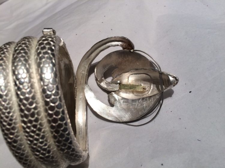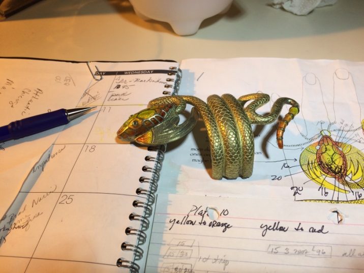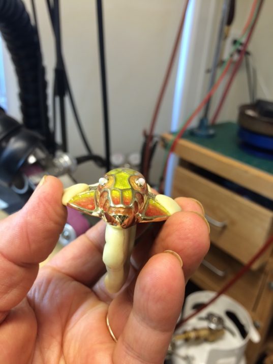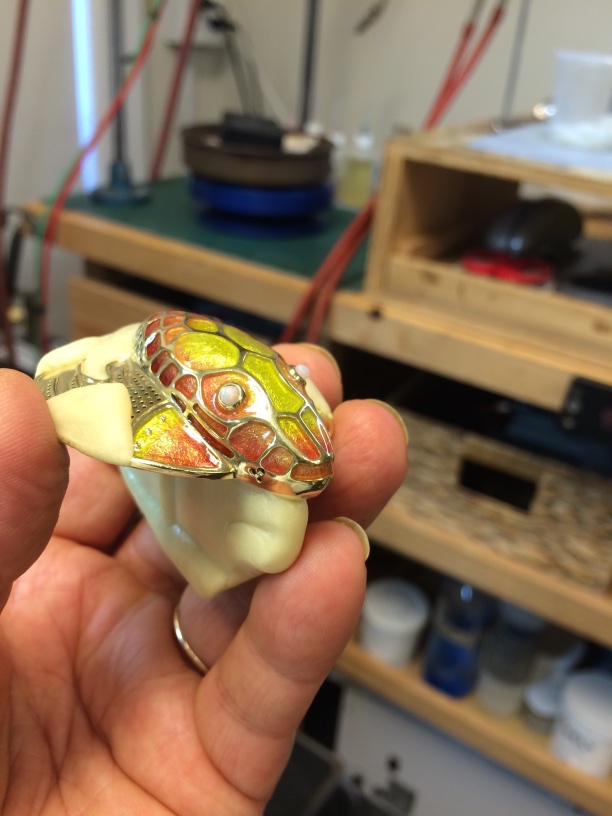 Time to cast in gold, and I began the detail work. After casting all needs to be chased to bring out the detail. You can see how the enameling took place,from one end of the jewel to the other. After cutting just the right opals Whoopi requested, shaping and polishing took place before setting them into the “Dragon’s” eyes on the head and ring.