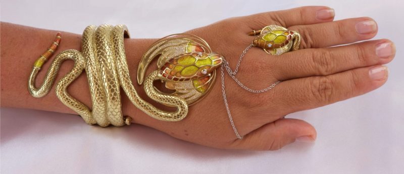 Birth of “The Dragon” Now Whoopi Goldberg Jewelry, create here in the technique of Champleve enamels. This bracelet and ring combo was influenced by the jewel designed by Alphonse Mucha and executed by George Fouquet, “The Serpent” 1899 for Sarah Bernhardt.