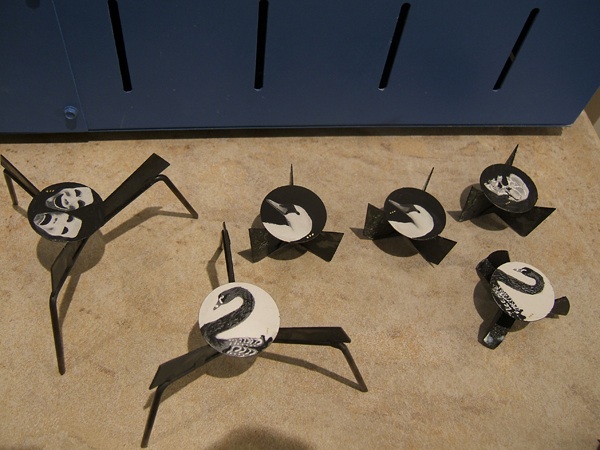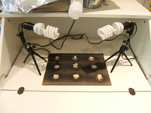● once the sprayed pieces are on the floor of the exposure booth, place the transparency negatives on the surface of the emulsion (dull side down for a film negative)