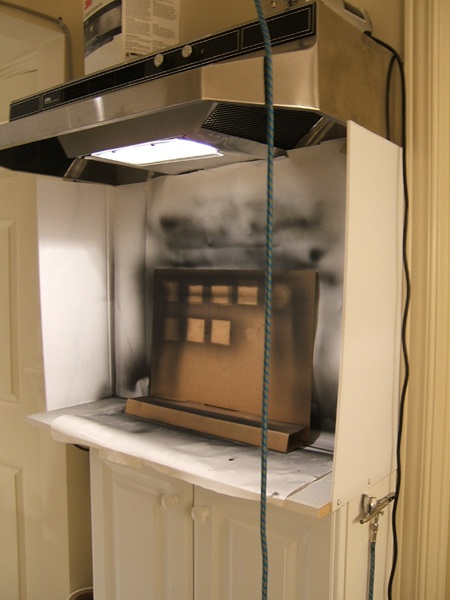 ● move cardboard with sprayed enamels to the light booth. (Emulsion is viable up to 20 minutes)