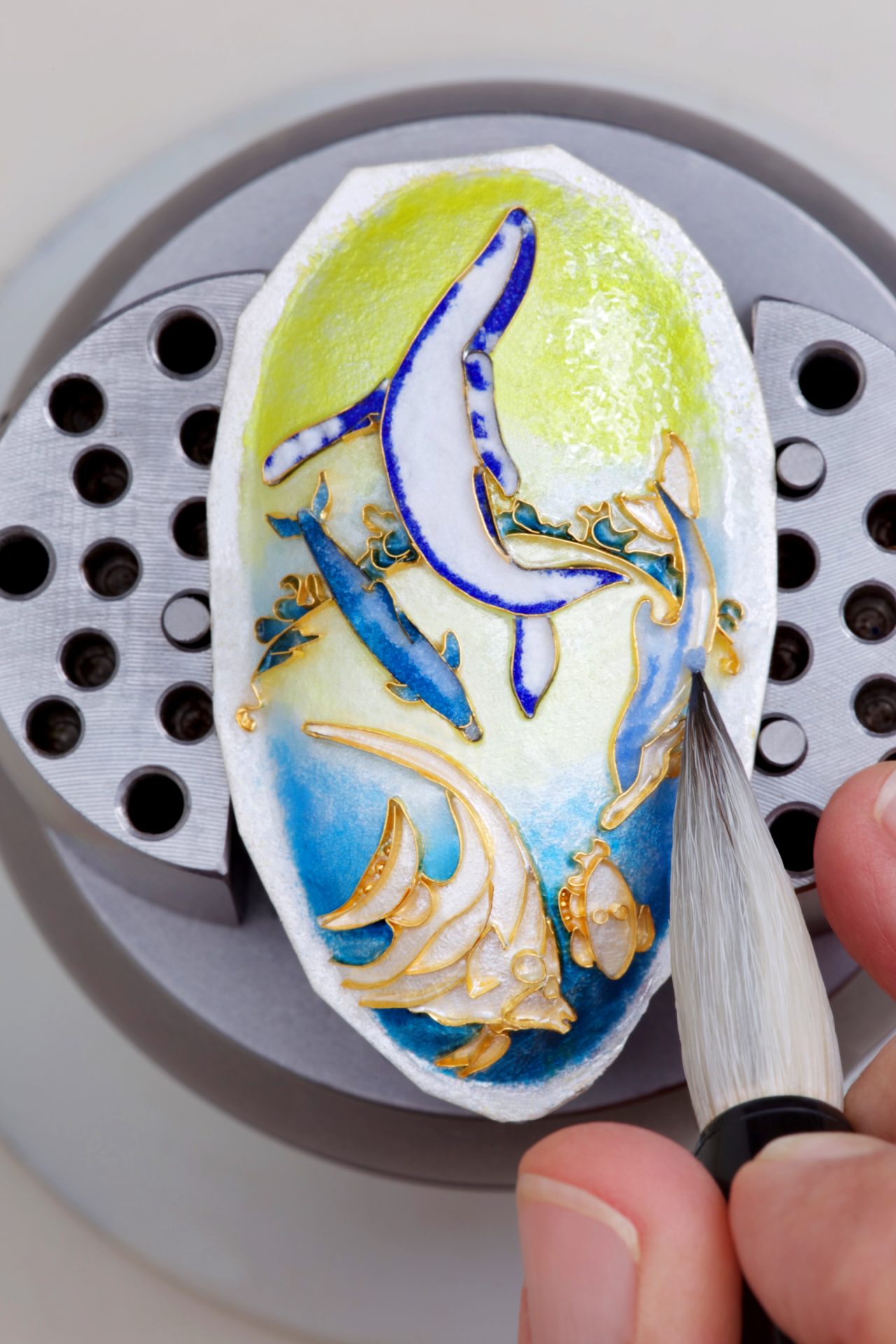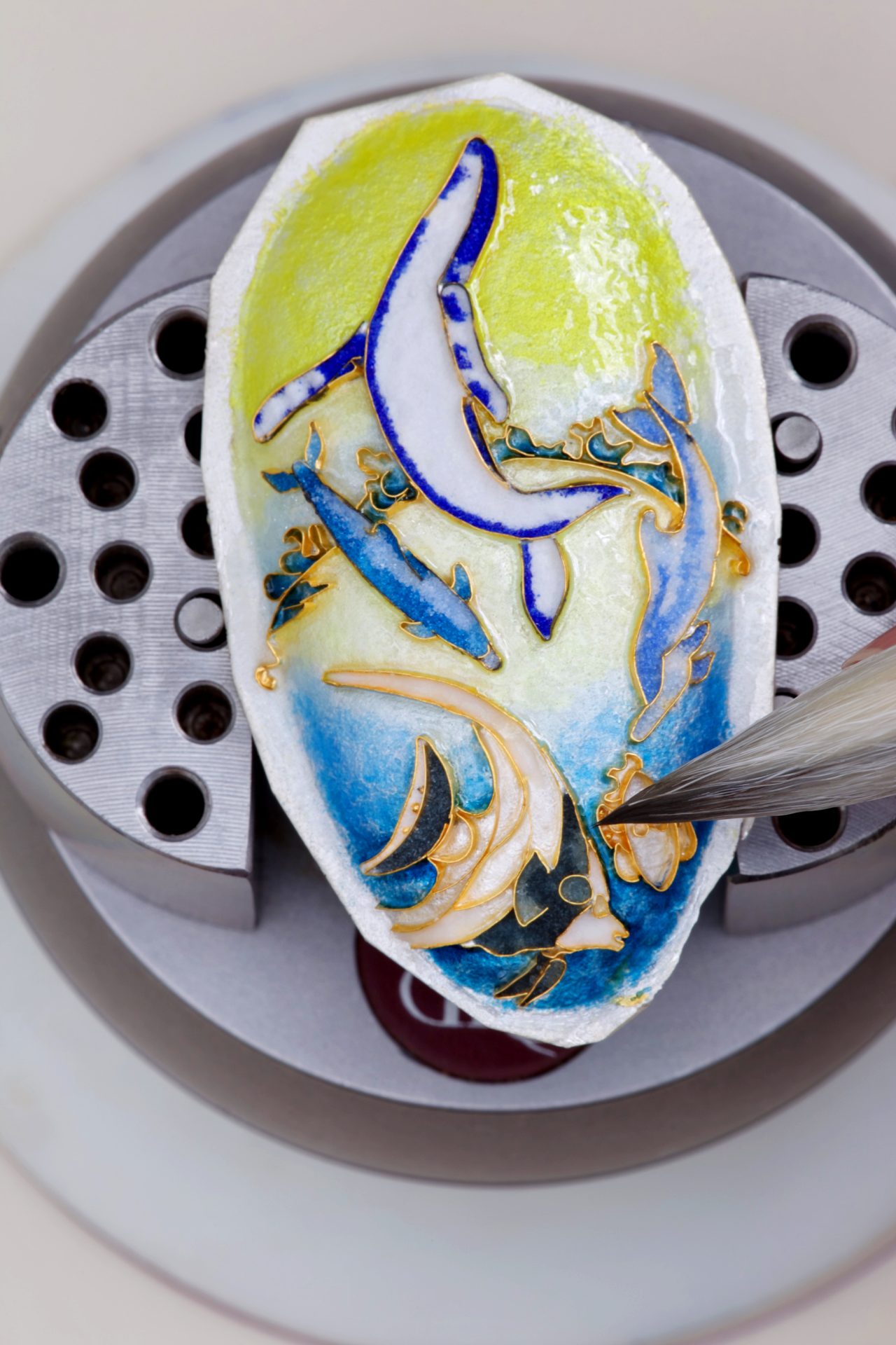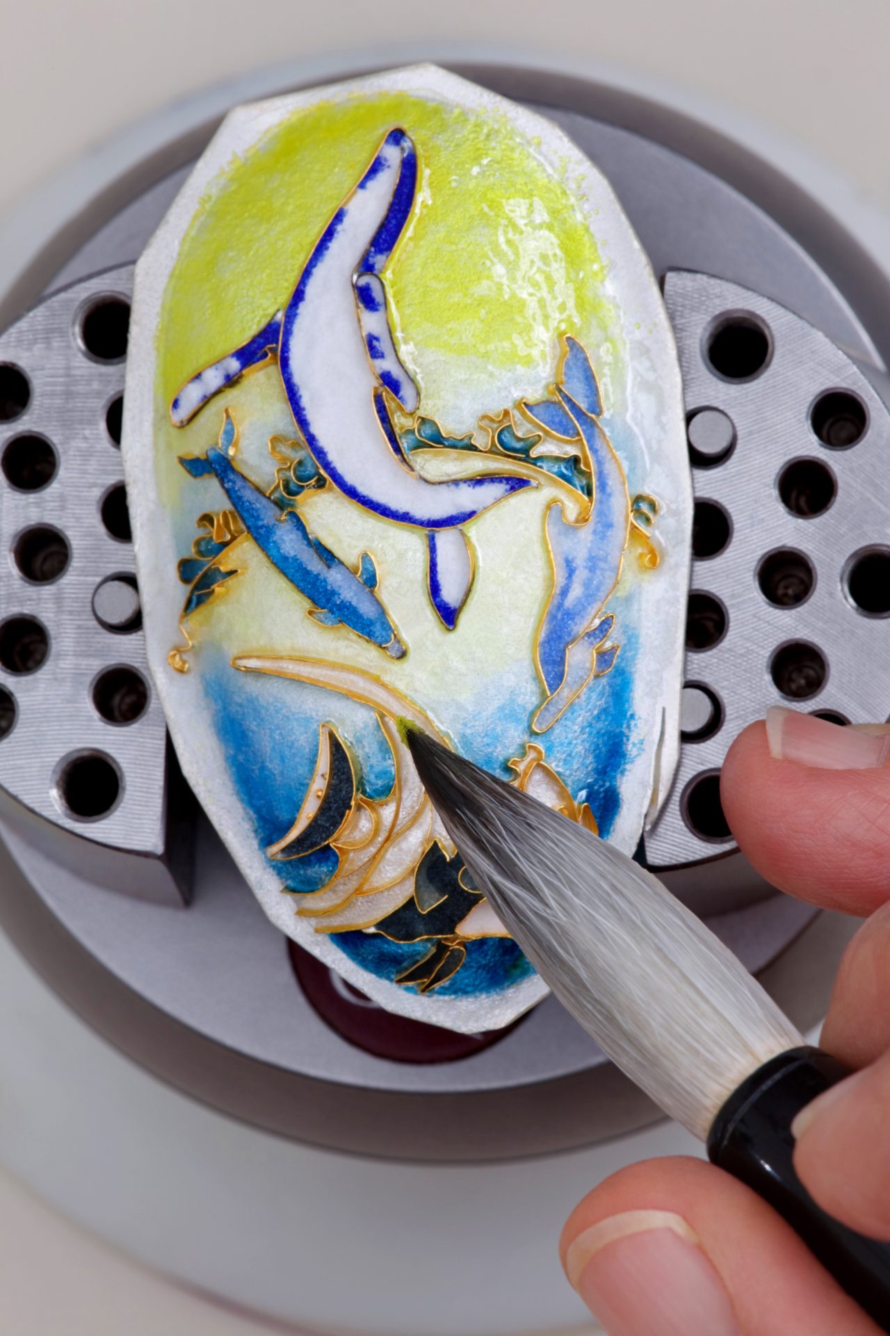 After the enamel has dried, it is fired in a kiln and repeated until the desired color and depth is achieved. The jewel is then ground and polished to form a smooth surface and a setting built for the cloisonné piece in 18k gold.