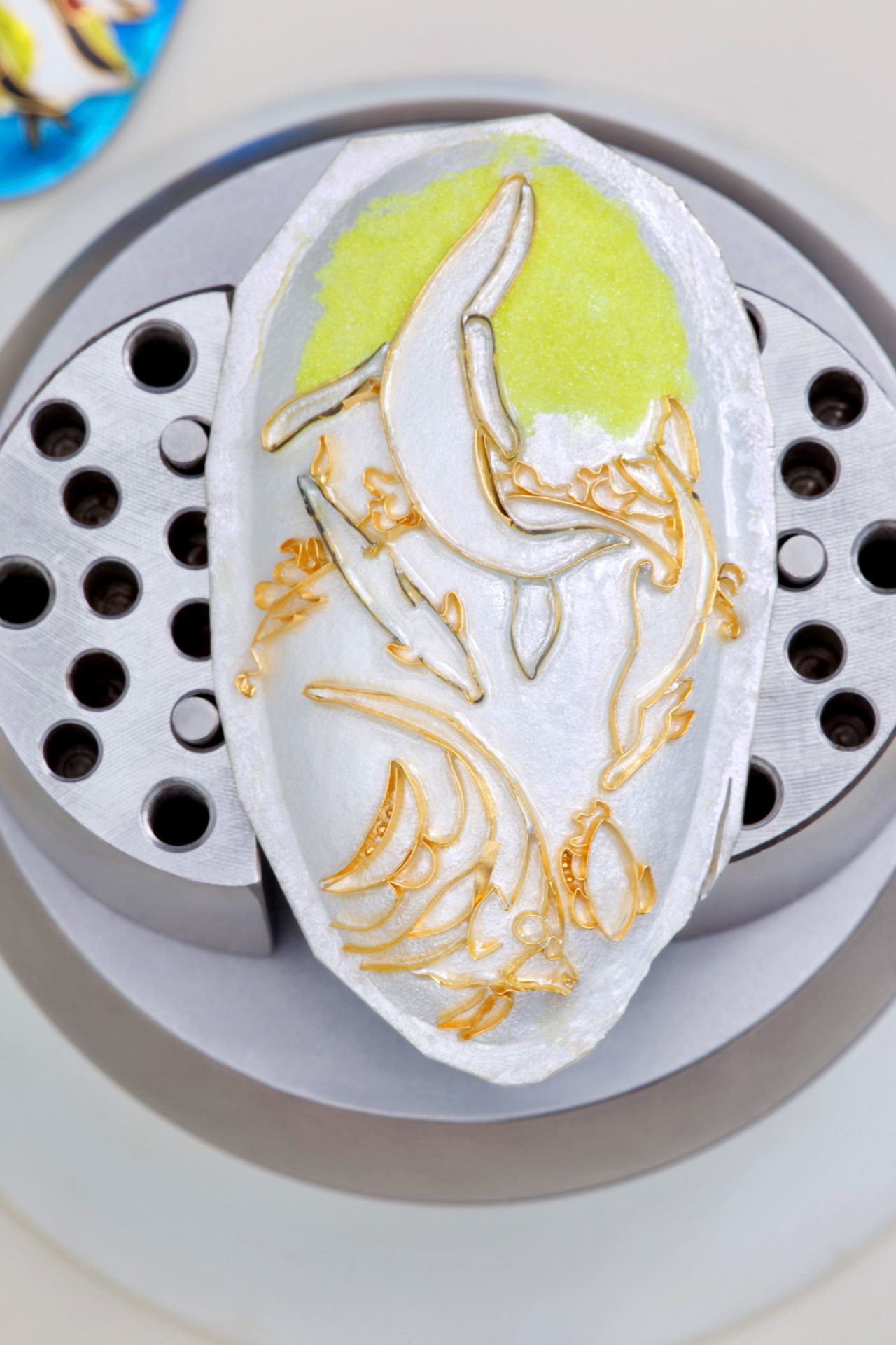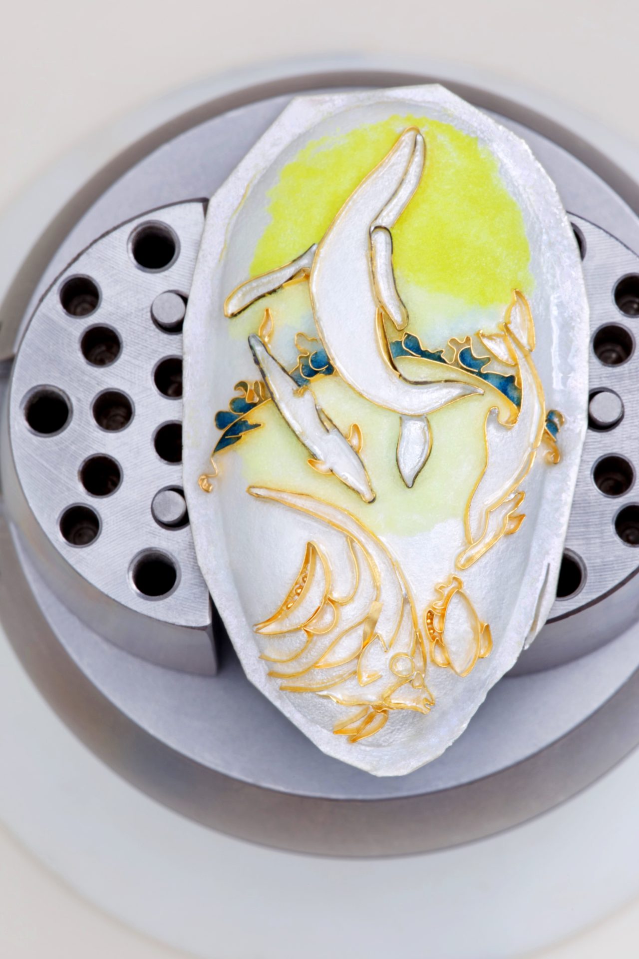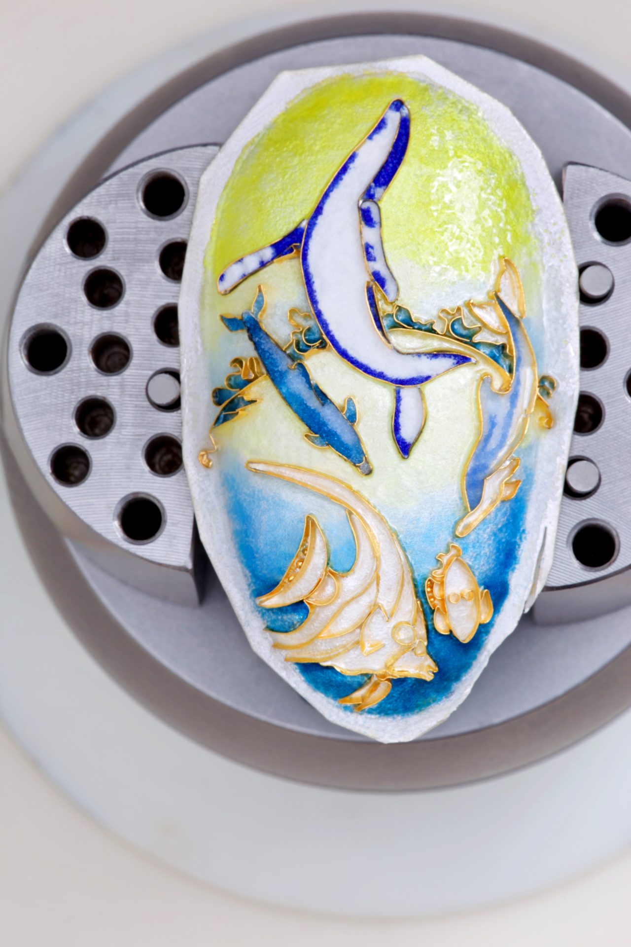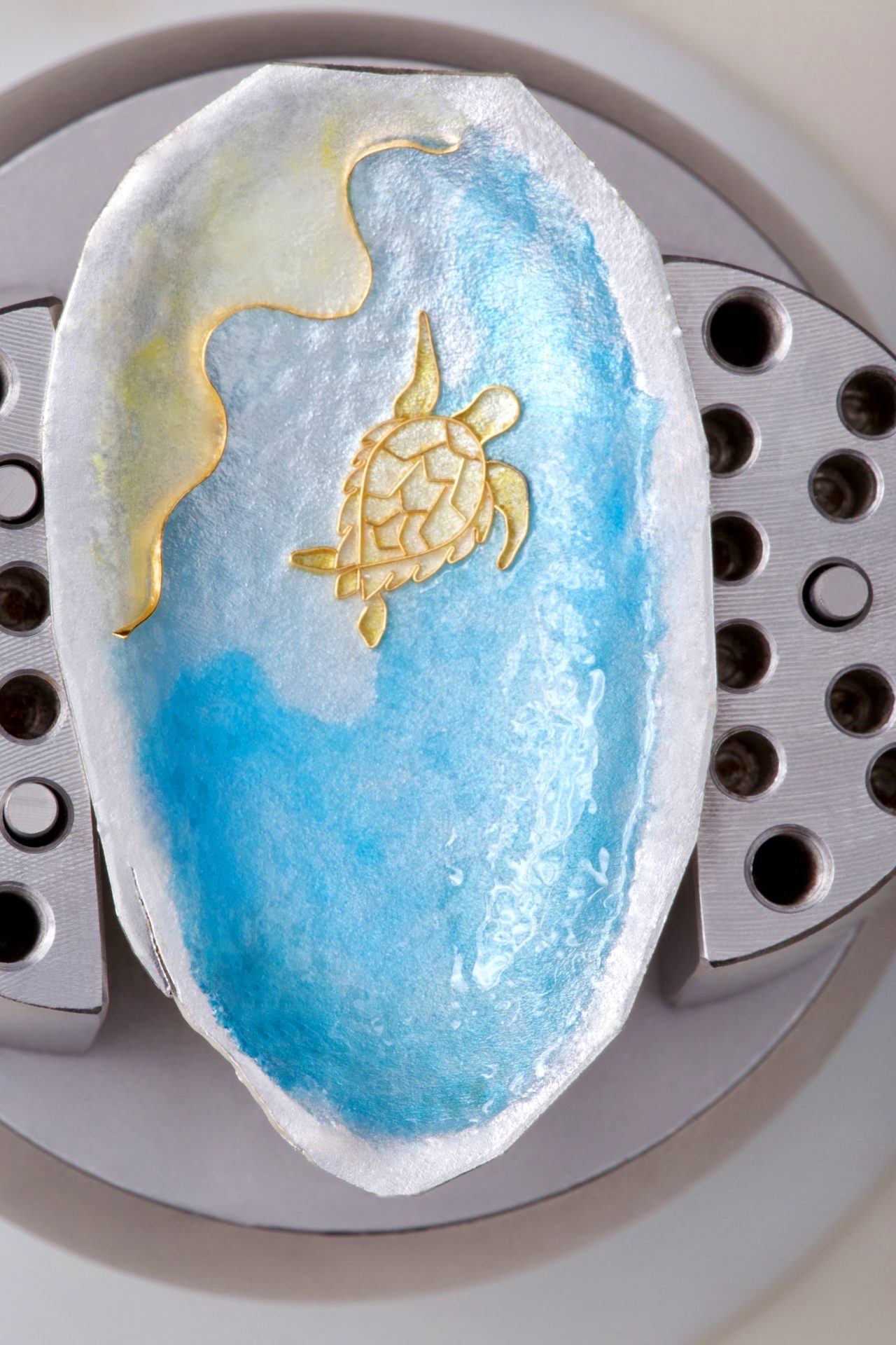 After the enamel has dried, it is fired in a kiln and repeated until the desired color and depth is achieved. The jewel is then ground and polished to form a smooth surface and a setting built for the cloisonné piece in 18k gold.