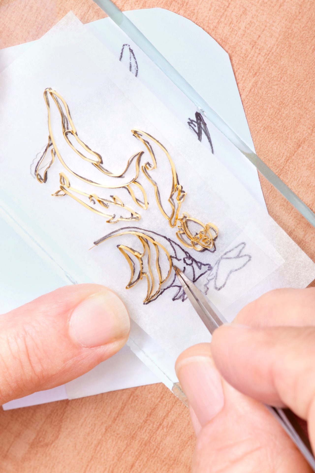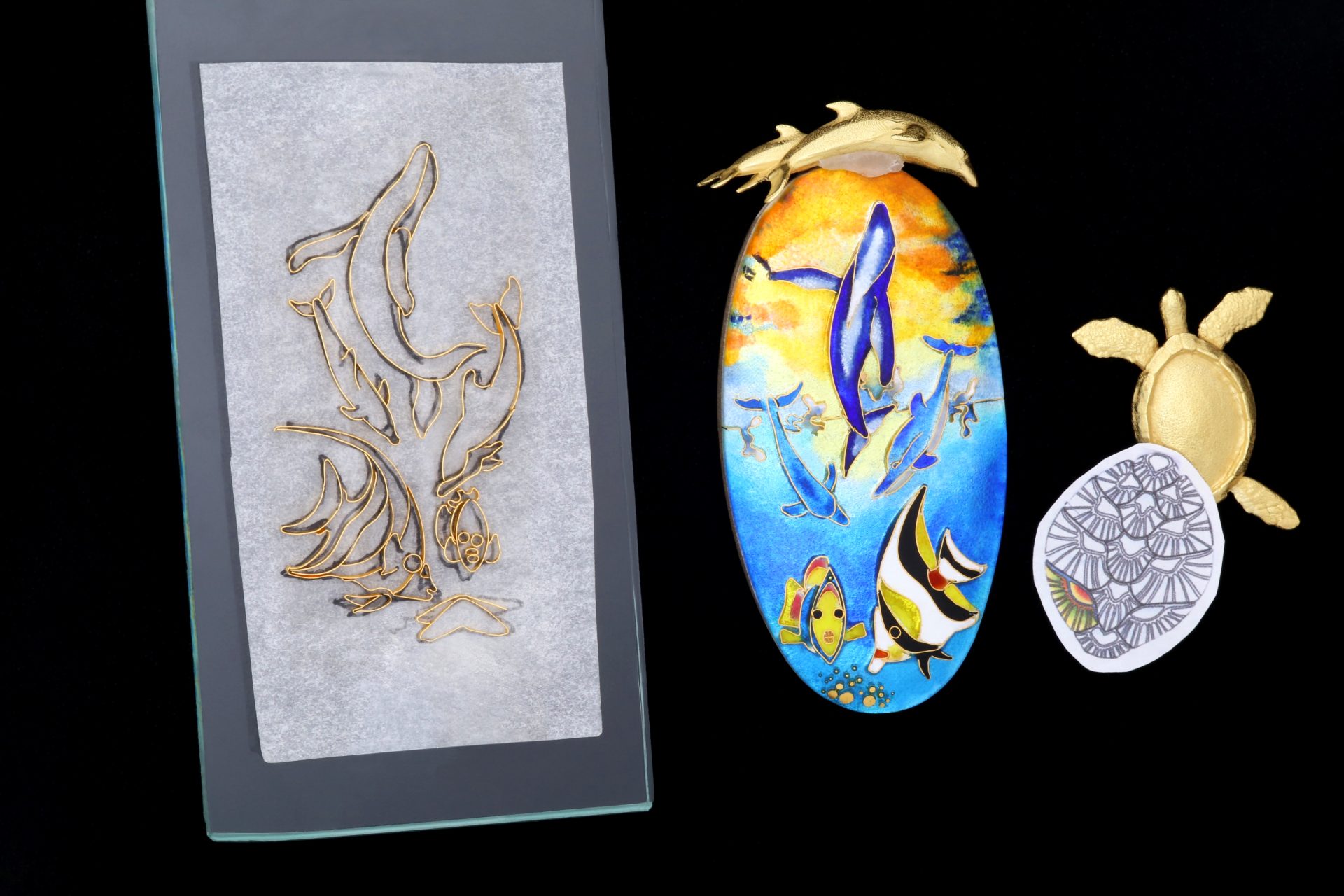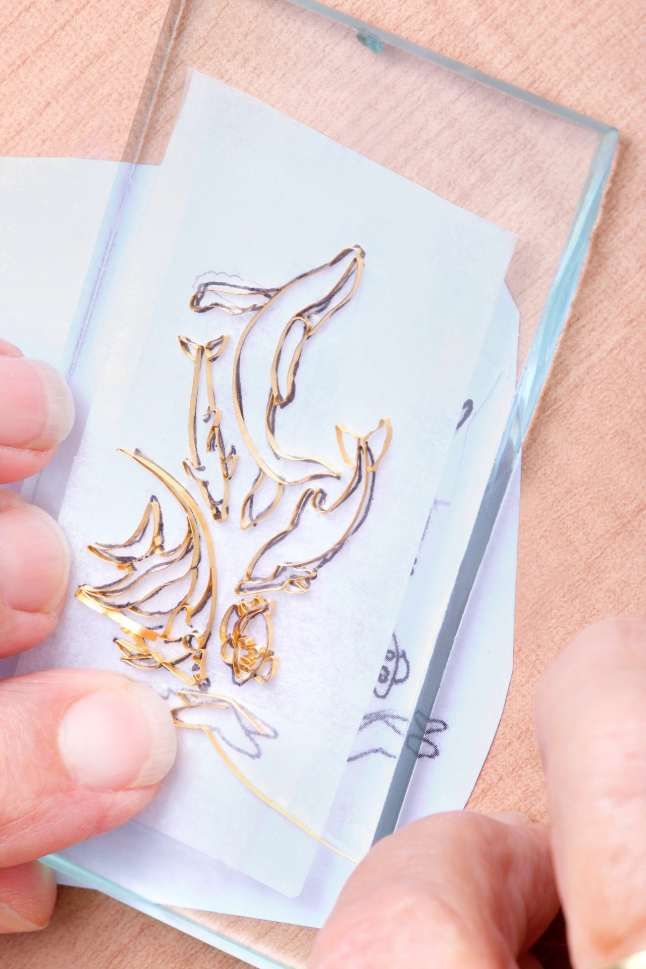 After the original artwork is decided upon, the metal ribbon-like strands of 24 karat gold wire are individually bent, twisted and oftentimes soldered together to produce a blueprint for where the colored enamels will later be painted. And this drawing is used to make the intricate design.