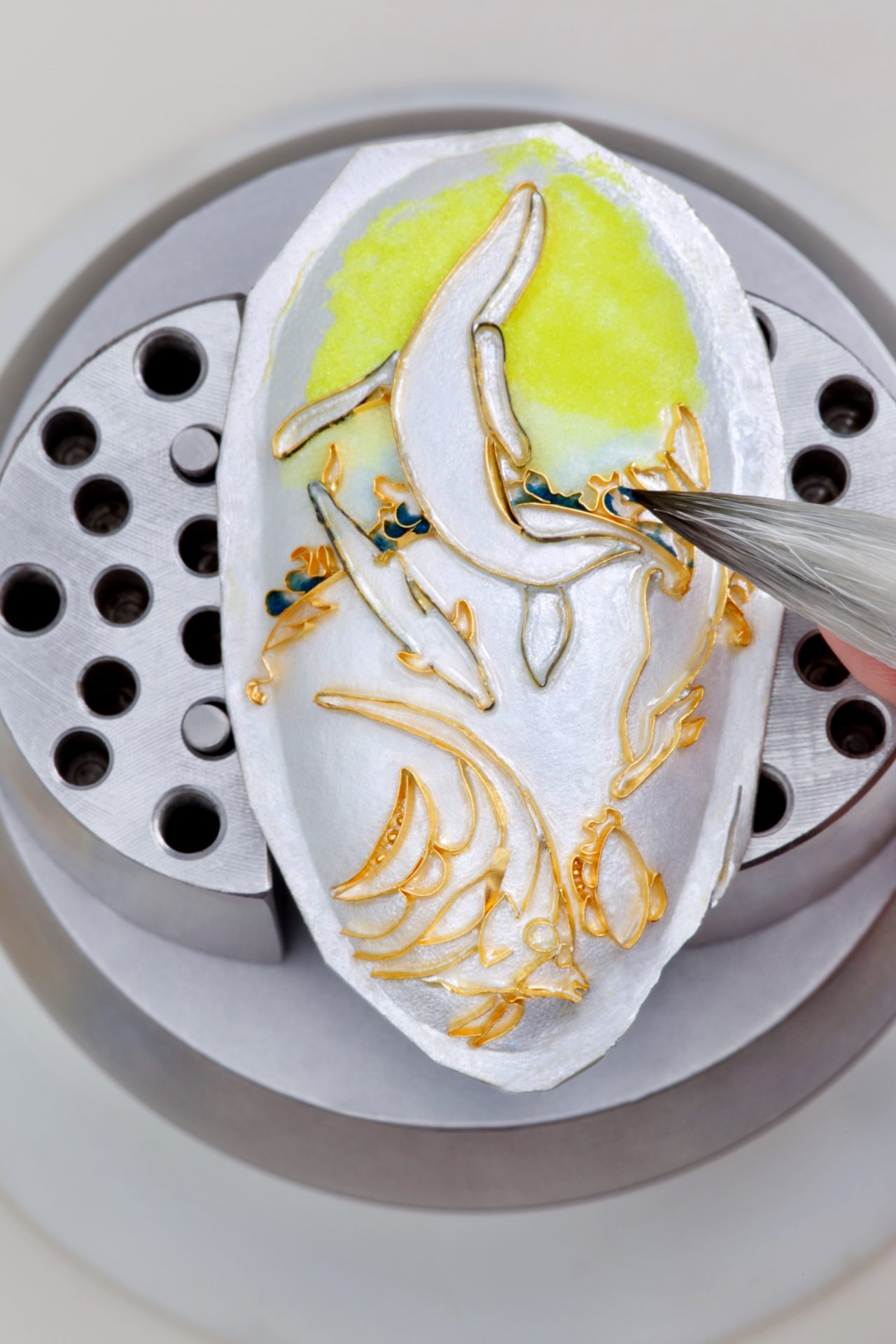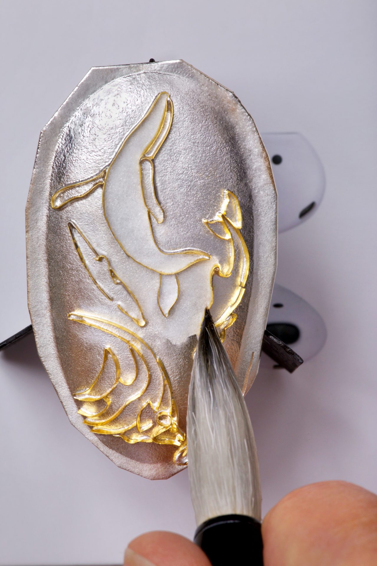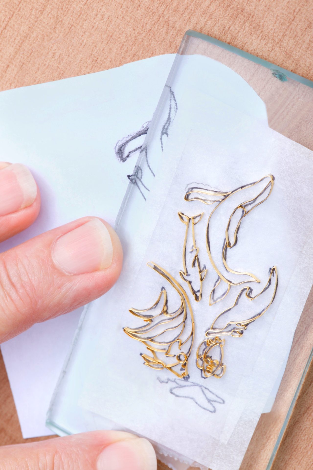 After the original artwork is decided upon, the metal ribbon-like strands of 24 karat gold wire are individually bent, twisted and oftentimes soldered together to produce a blueprint for where the colored enamels will later be painted. And this drawing is used to make the intricate design.