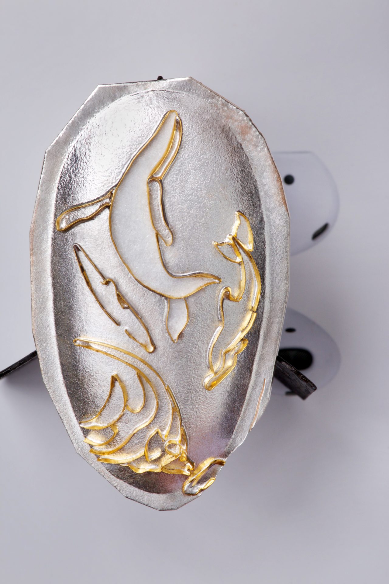 With my design complete I began the wire work. As a process, I first form the base metal of fine silver, into the shape of the desired project. Then, the cloisonné wire – made of pure gold, is bent into shapes that define the colored areas of the finished piece. All bends are made of this fine gold ribbon, at right angles to the base allowing them to stand on their own and be fused to the fine silver.